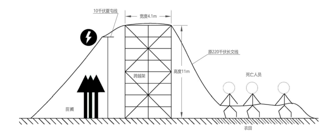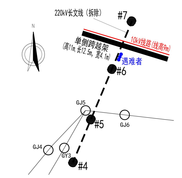 2023 年5月8日,施工項(xiàng)目部安排施工人員在原 220 千伏長(zhǎng)文線(xiàn) 6-7 號(hào)桿塔間進(jìn)行10千伏夏屯線(xiàn)跨越架搭設(shè),因民事阻工僅在事故發(fā)生處南側(cè)搭設(shè)了單側(cè)跨越架。