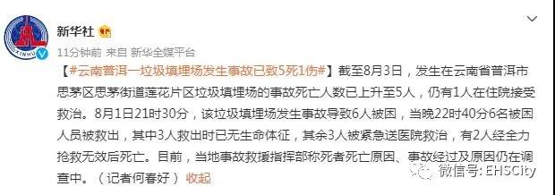 【#云南普洱一垃圾填埋場(chǎng)發(fā)生事故已致5死1傷#】截至8月3日,發(fā)生在云南省普洱市思茅區(qū)思茅街道蓮花片區(qū)垃圾填埋場(chǎng)的事故死亡人數(shù)已上升至5人,仍有1人在住院接受救治。8月1日21時(shí)30分,該垃圾填埋場(chǎng)發(fā)生事故導(dǎo)致6人被困,當(dāng)晚22時(shí)40分6名被困人員被救出,其中3人救出時(shí)已無(wú)生命體征,其余3人被緊急送醫(yī)院救治,有2人經(jīng)全力搶救無(wú)效后死亡。目前,當(dāng)?shù)厥鹿示仍笓]部稱(chēng)死者死亡原因、事故經(jīng)過(guò)及原因仍在調(diào)查中。(記者何春好)極目新聞?dòng)浾呤崂戆l(fā)現(xiàn),普洱市中心城區(qū)生活垃圾焚燒發(fā)電廠建設(shè)項(xiàng)目,為思茅區(qū)2019年23項(xiàng)重點(diǎn)工作之一,于2019年啟動(dòng)建設(shè),并優(yōu)先完成填埋區(qū)建設(shè)。2020年,普洱市相關(guān)領(lǐng)導(dǎo)曾前往思茅區(qū),實(shí)地調(diào)研市中心城區(qū)生活垃圾焚燒發(fā)電廠項(xiàng)目推進(jìn)工作。公開(kāi)資料顯示,2020年3月,配套填埋場(chǎng)正式投入使用,填埋場(chǎng)類(lèi)型為填埋生活垃圾的衛(wèi)生填埋場(chǎng),庫(kù)容為30.1萬(wàn)立方。