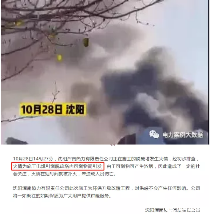 10月28日14時27分,沈陽渾南熱力有限責(zé)任公司正在施工的脫硫塔發(fā)生火情,經(jīng)初步排查,火情為施工電焊引燃脫硫塔內(nèi)可燃物而引發(fā),由于可燃物可產(chǎn)生濃煙,因此造成了一定的社會關(guān)注,火情在短時間就被撲滅,未造成人員傷亡。