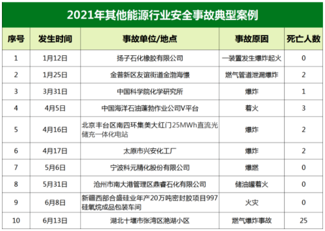 除電力、煤礦事故外,其他能源行業(yè)安全事故也時(shí)有發(fā)生。國(guó)際能源網(wǎng)記者總結(jié)了2021年典型能源安全事故發(fā)現(xiàn),其他能源行業(yè)安全事故多為火災(zāi)事故。天然氣、化工廠、儲(chǔ)能電站依然是火災(zāi)事故隱患較為集中的領(lǐng)域。因此,做好消防措施也是減少人員傷亡的有效手段之一。