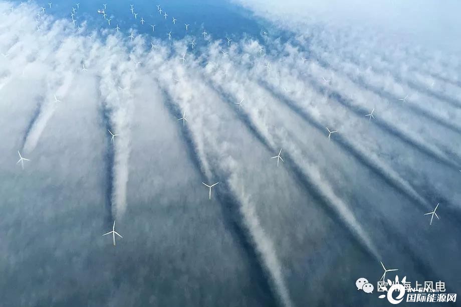 Horns Rev 1是全球第一座商業(yè)化規(guī)模的海上風(fēng)場(chǎng),最早由沃旭開發(fā),安裝了80臺(tái)2MW Vestas風(fēng)機(jī),葉輪直徑80米,輪轂高度80米,總裝機(jī)160MW。場(chǎng)址所在位置風(fēng)功率密度398W / m2,最遠(yuǎn)離岸距離18公里,最大水深14米。下圖這張顯示風(fēng)機(jī)尾流影響的著名照片就來自于這座風(fēng)場(chǎng)。