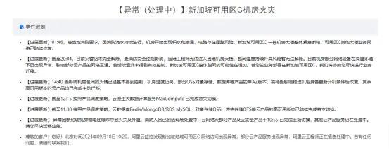 火災(zāi)公告顯示,11日凌晨01:46,接當(dāng)?shù)叵酪螅蛳罎菜掷m(xù)進行,機房開始出現(xiàn)積水和滲漏,電路存在短路風(fēng)險,新加坡可用區(qū)C一棟機房大樓整體緊急斷電,可用區(qū)C其他大樓業(yè)務(wù)網(wǎng)絡(luò)已陸續(xù)恢復(fù)。